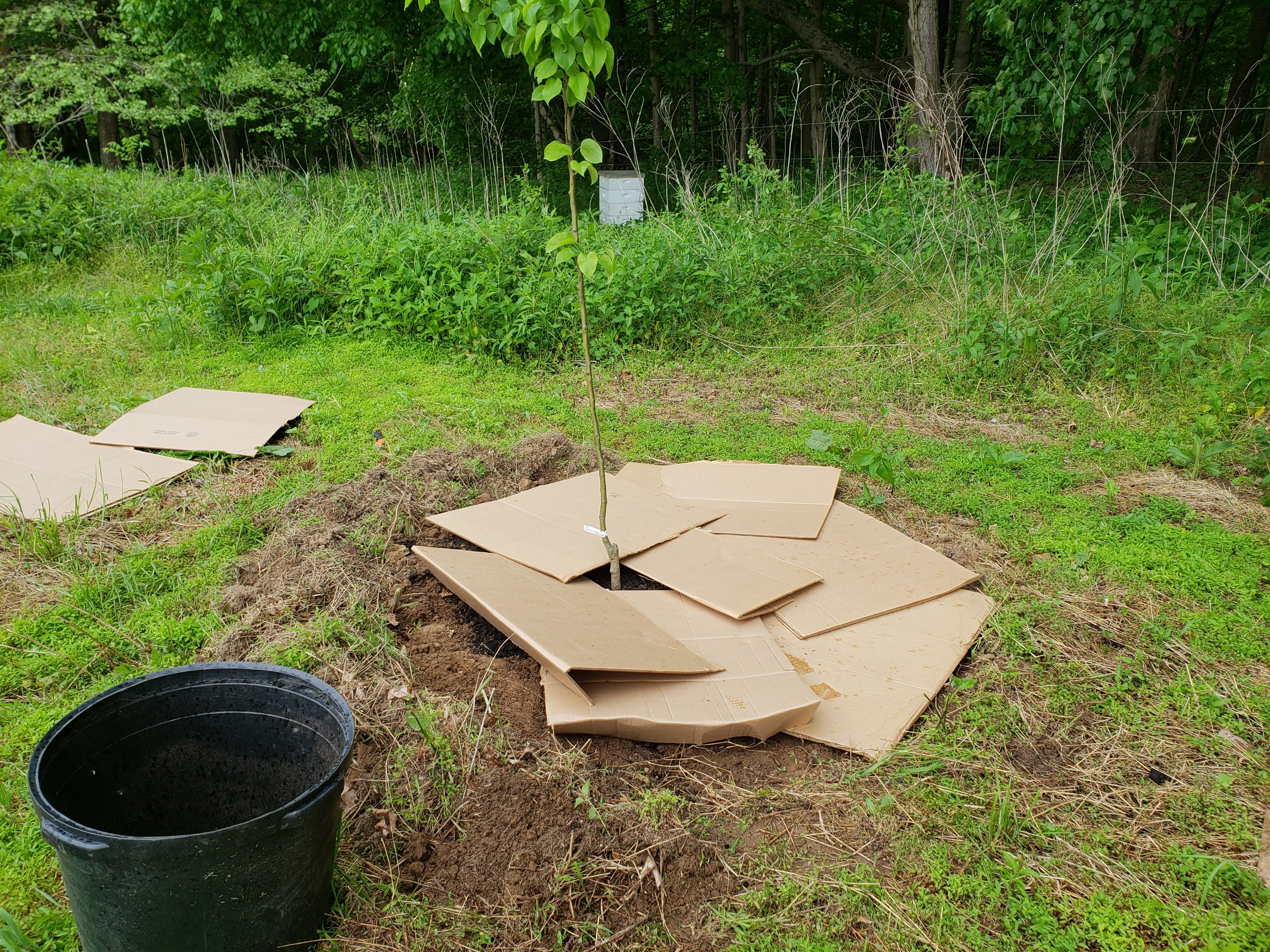 The other hedgerow, on the north end of the market garden, originally planted in fall 2017, continues to expand. Everything is looking great, even the pear I had to whack back just above the graft after the deer rub got it as there was a miscommunicationabotu fencing when I left to Europe in the fall. oops. These nuclei are great to see displaying the small scale intensive principle for sure. And being full on growth during this warm and wet spring it is chop and drop time of course as well. Furthermore, I am now dropping in a few more layers of the food forests hedgerow as I developed the anchors and guild herbaceous plants and now adding more fruiting bushes like currants, Aronia, and more. I have also expanded both east and west with more fruit tree nuclei, Japanese plum and Asian Pear, which meets up against a back stop that my grandfather had built for his dreams of having a softball diamond here. It had become junk pile over the years but some hard work has it ready for vines, I do believe hardy kiwi it is. Maybe Akebia, decision has to be made today, ha. Oh and some hoops too!