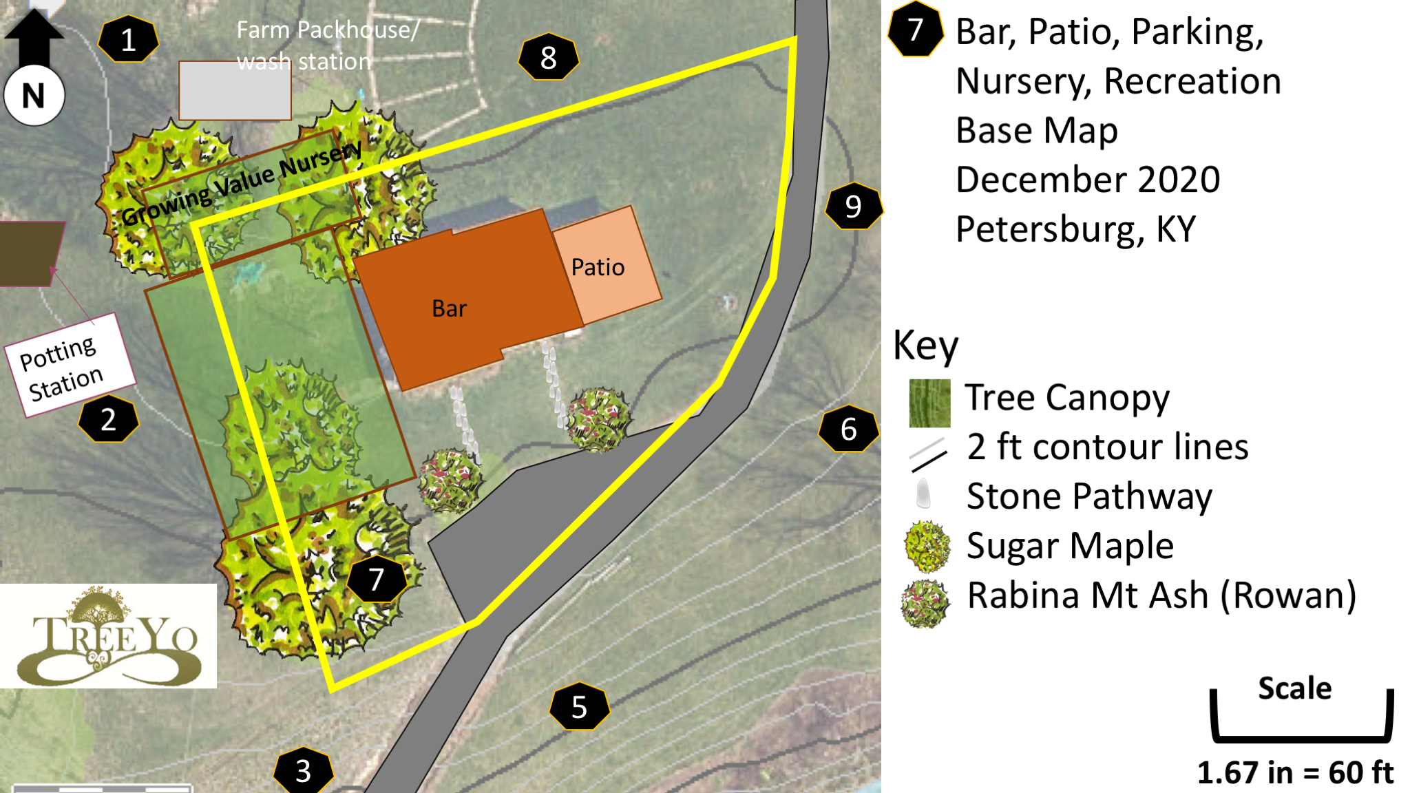 The expansion of the Growing Value Nursery here at Treasure Lake was enough for a whole years worth of writing and work. Nonetheless it is just one part of the bigger story. This year really marked a significant growth of the size and offerings of the nursery. The size here at Treasure Lake tripled, we implemented a new urban site in Pricehill in Cincinnati, and the organization of the nursery was upgraded. Each year I have been back I have taken one step further into the organization and day to day operations, especially in the very busy and demanding spring. From a design perspective, with the tripling of size, it is the four very large sugar maples that really make this all possible. Of course the water infrastructure as well as access and the building headquarters being right there is critical as well. The design drawings show this below as well as the 7000 sq foot area taken up by plants.