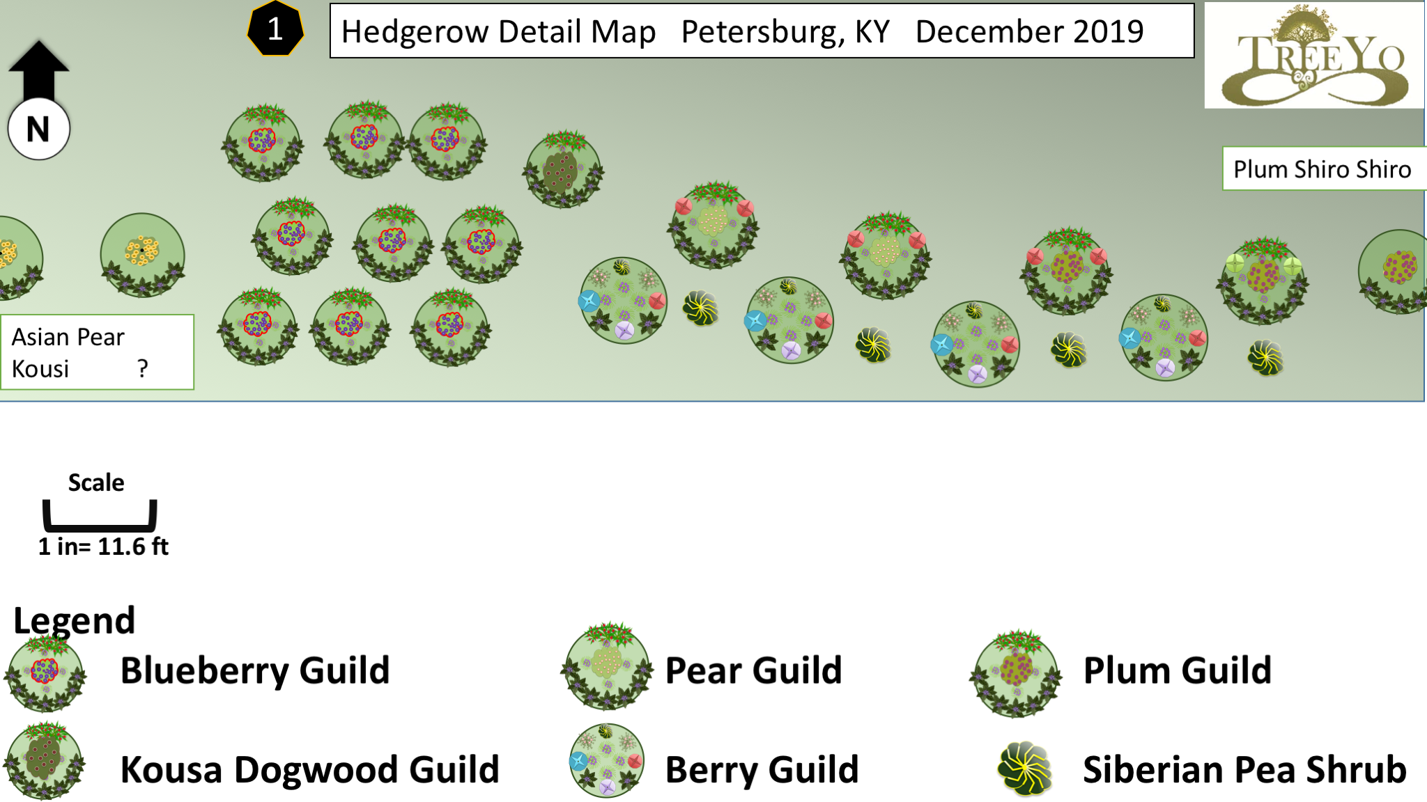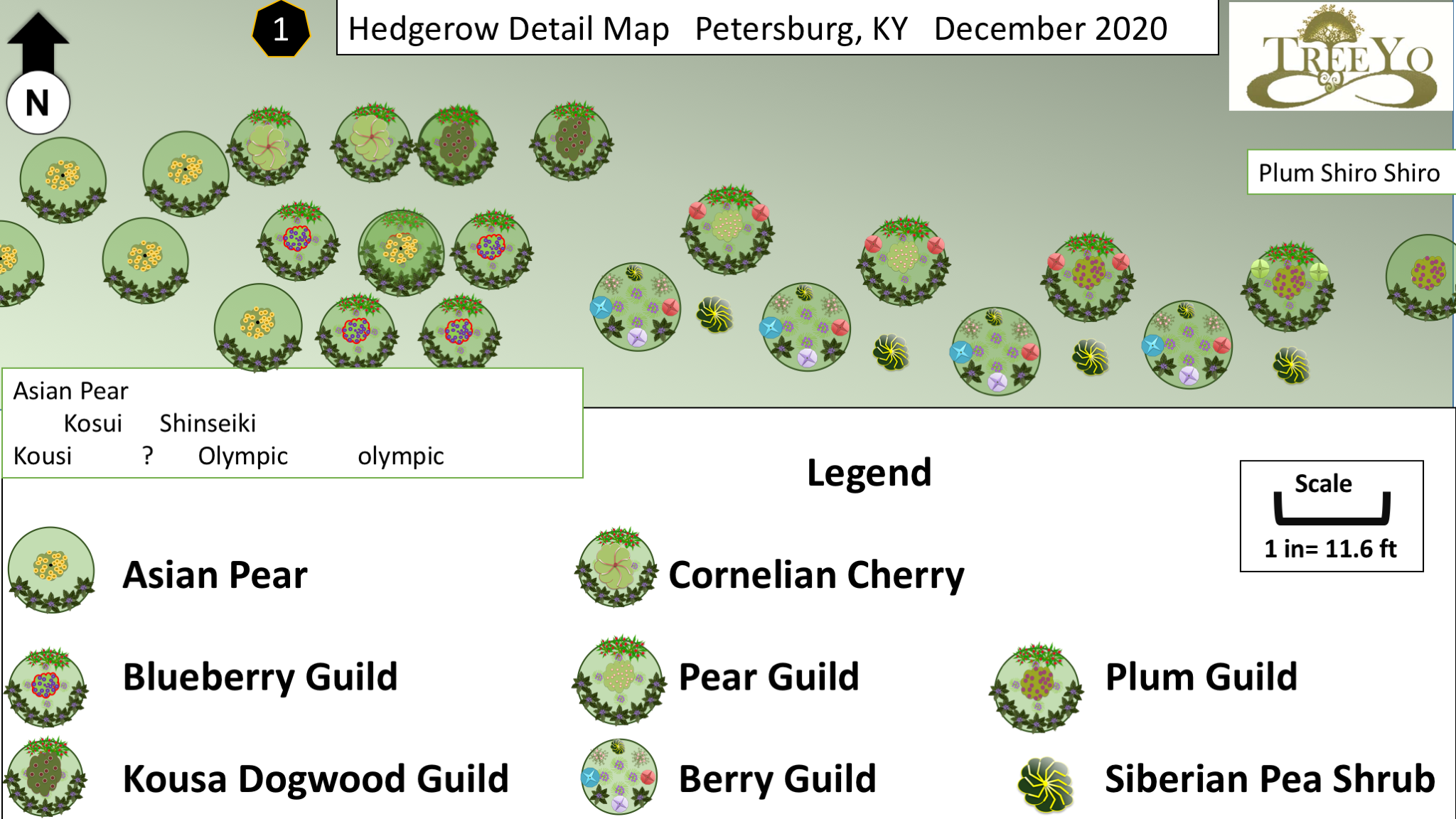 This being my oldest planting of any real size and success (fall 2017 start), this section continues to fill in and grow well. The nuclei are ready to merge even more this year as my 6 ft diameter beds have grown to be more like 8 to 10 ft diameter as the woodchip mulch is extended outwardly and thickened each year. A lot of energy goes into this 250 ft long hedge each year so I decided to augment some things this fall. With some of the blueberries simply never performing, even after replacing a few of them, I planted other stuff right next to them. I figured why even bother pulling it out and lets take advantage of these circular growing spaces that have been mulched and fertilized for years. So five of those circles were augmented. The first was to add a Kousa dogwood right next to one that has been growing quite well since that fall 2017 inception. Next to that two cornelian cherry as they are in the same family. In front of that line, a couple of the circles got the Asian Pear Olympic variety. That felt good to make that switch and know these trees will instantly thrive because the soil has been building for years. As I did this I thought why not more Asian Pears and on my walks of checking on these new plantings over the next weeks I let two more spots for Asian Pears reveal themselves, partly from looking at the maps seen below and partly form on site observation. So we thickened the back hedgerow on the far west side with two more Asian Pears from the nursery that were looking very ready for a soil home. Kosui and Shinseiki bring our total of Asian Pears on the property up to 10 with six different cultivars. I look forward to collecting more cultivars. And with the 2021 season ahead, unless we get a late frost again like 2020, we should be starting to see some fruit production from plums and pears as the grafted trees coming into fruit age is upon us.