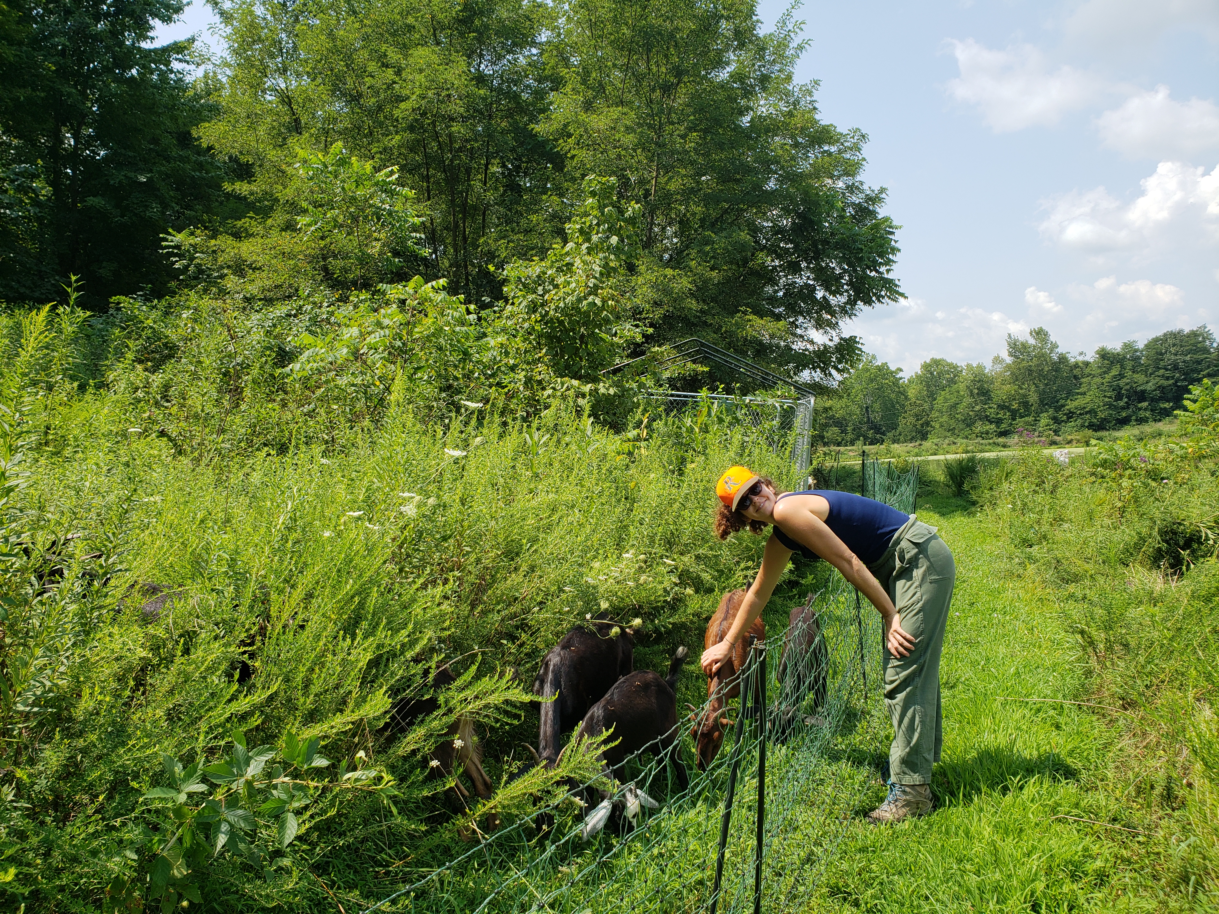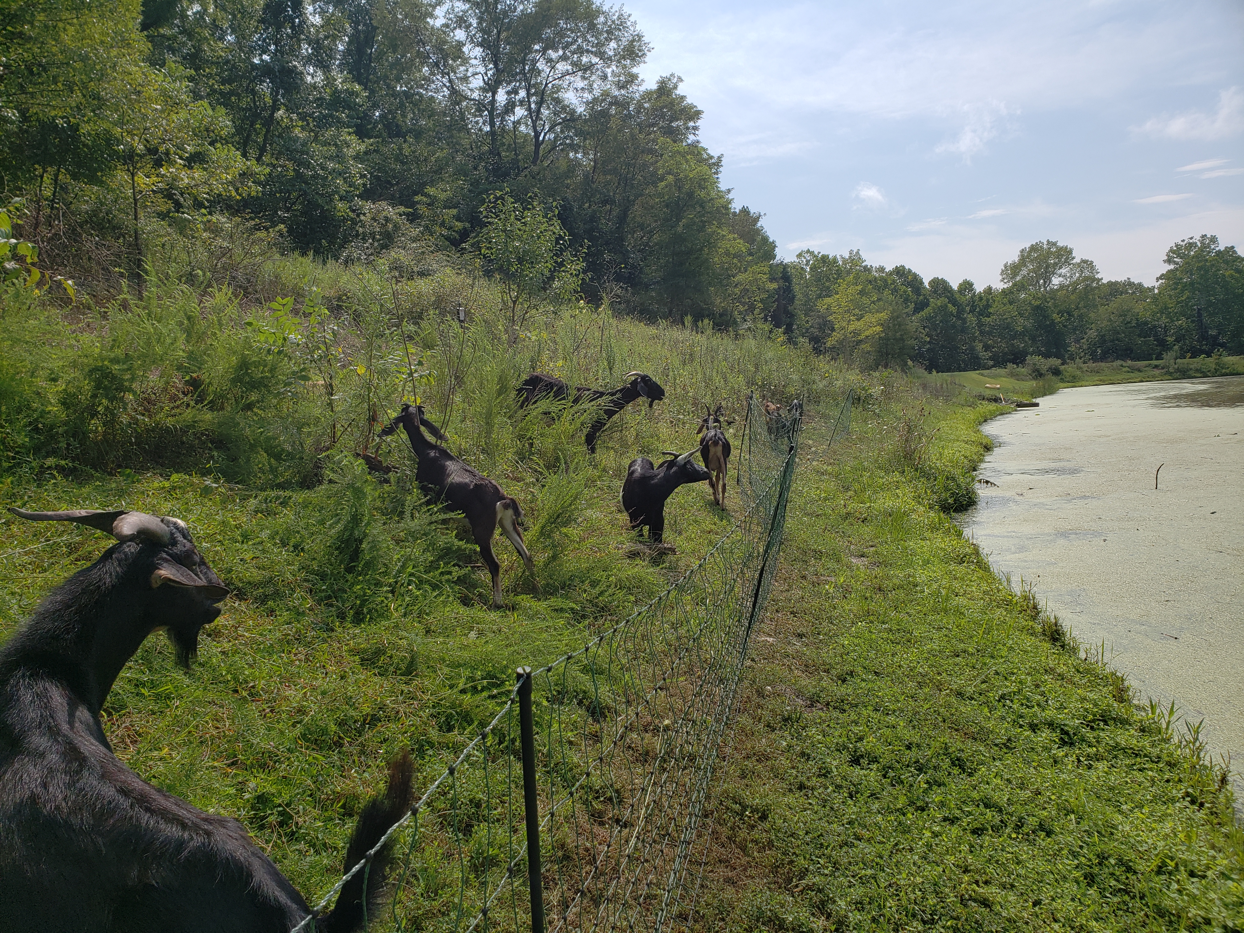 were 17 goats and I did have 600 feet (180 m) of fencing but still it went quickly even in the humid and warm time of the year where growth is full on. So they would eat back the vegetation they could reach and easily work for. I would then leave them in there for a day or two more and supplement with the cut and carry/coppice/pollard method from in or out of the electric fence area. They could then gorge themselves on the foliage I made available and then go back to foraging stuff that was a little more effort for them to eat. In this way I had the animal impact I was looking for and they stayed nourished. I could easily tell not only with my eye on how much forage was left but also by the demeanor and behavior of the goats. When food was low they were a little more agitated and escapes were attempted if I waited too long. Once I would give them fresh pasture to roam in, they were fine. The design question becomes, what will be my time availability for making electric fence moves as well as their housing and making sure they have ample water and general care?