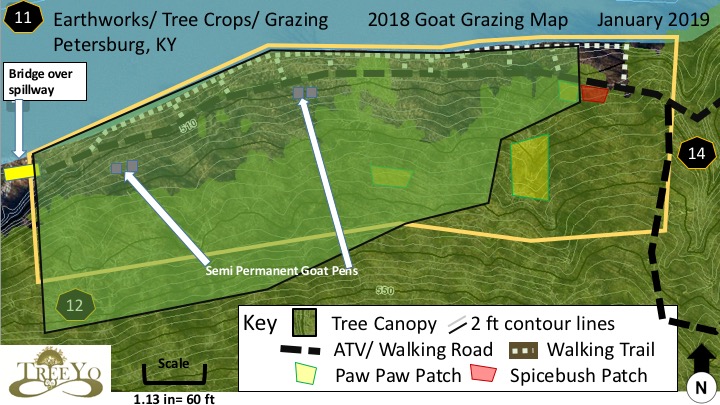 pastures to the least they can so that this overhead cost doesn’t eat into profits, again often causing disastrous affects. Permanent fencing is expensive indeed, laborious to setup, and is permanent, it doesn’t move. Electric fence allows you to bunch the animals closely and just when overgrazing can occur, you simply build a new paddock and allow the animal to march into it and eat the new grass. Don’t get me wrong though, electric fence is work, and the pain of taking them down and putting them back up is real. And if you are using the poultry netting type there is two drawbacks. One is you have to come through with a weedwacker or trimmer or machete first and knock the vegetation back to the ground so it doesn’t trip out the electric pulsation from the battery. And when i say knock it back to the ground i mean, because every little nub the fence gets stuck on and slows you down and wears out the fence. Second is baby goats and sheep may get stuck in the fence and essentially be shocked to death by the repeated shocking. I have had baby goats get stuck in the poultry netting style electric fence when I had it turned off. Whether or not they would have been zapped back before this happened, I simply don’t know. An animal farmer friend and past PDC student of mine advised me against this style of fencing saying that he moved away from it cause he was losing too many lambs from it. So instead of the poultry style there is the setting up of multiple strands of wire. While it maybe more work, it will save you time in other areas and may prevent animals from being killed or severely injured. However the poultry netting goes up quickly, and does allow for several different species to be integrated together. Alternatively permanent fence gives you a certain amount of peace of mind with your baby livestock not being injured by electric fence and an extra layer of predator protection. Knowing when birthing season is and the planning around that will lead you the designer to have your birthing permanent pastures well stocked with grass. So the design questions becomes, how do you order your electric fence paddock moves? Which style of fence do you buy? Is any permanent fencing required? Electric fence can be of course combined with permanent fencing. Here is a video below of rotational grazing of goats at Treasure Lake in 2020.