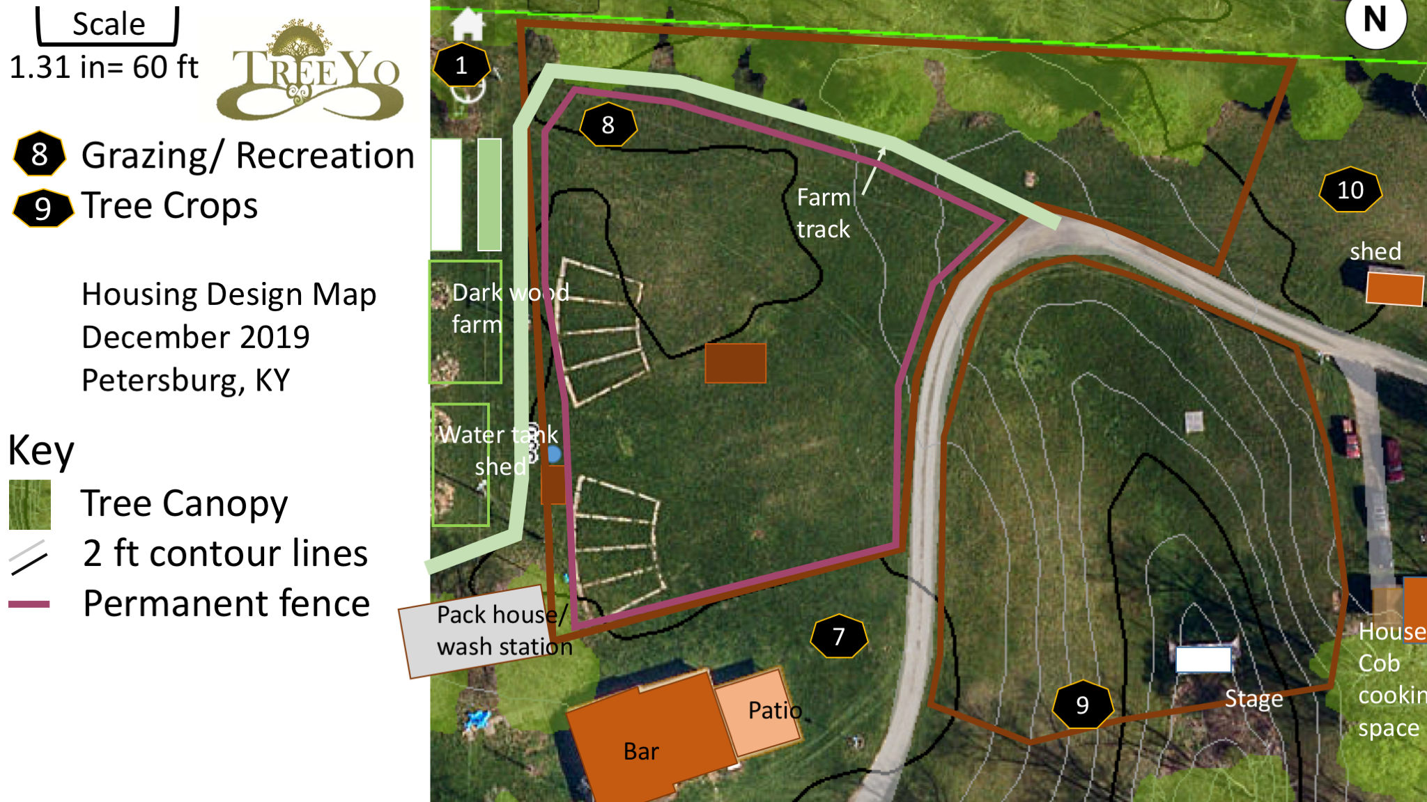 Below are designs/pics to set the stage for a practical application from Treasure Lake as I design future animal integration at Treasure Lake. It shows the assessment phase of design as the grazing is just one part of the greater whole. We will zoom on one of the areas seen below to bring further detail to the pattern.
