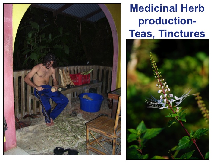 The tropics offers a plentitude of medicinal plants to keep health for ourselves and our domestic livestock. The processing of them allows people to gain access to health giving products and generates income. In the picture above on the left, the author can be seen processing the powerful medicinal herb that i s commonly sold in health food shops globally called Pau D’arco. This Amazonian herb was planted widely at the farm that I worked on in Costa Rica for nine months in 2005-06. It is processed similarly as another on farm medicinal that we had known as cinnamon. The Pau D’arco is harvested through cutting branches which does not harm the tree as it coppices if not over harvested. The bark is then peeled and the cambium layer is cut off and then dried. From there it is made into a dried tea or soaked in strong alcohol to make a dark and rich tincture. Both help with the immune system and are said to be good for helping with gut health as well.