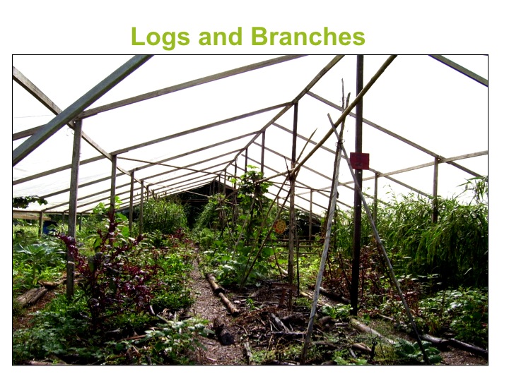 Another technique for building soil anywhere is mulching. However in the tropics with its rapid breakdown, logs and branches are used as mulch as well as cut grasses or herbs and other waste organic material. These higher concentrations of carbon are still consumed by fungus and insects but their breakdown is a bit slower. They can also be used on slopes to create terraces for quick, outer zone soil holding. In the below picture in our greenhouse in Costa Rica we used logs as garden borders and we would find branches and make small piles of them around our bigger, more established plants. Alternatively we would make bigger piles and use it as cover crop essentially with the space not growing any food products but rather just an area for building soil for a short period before transplanting.