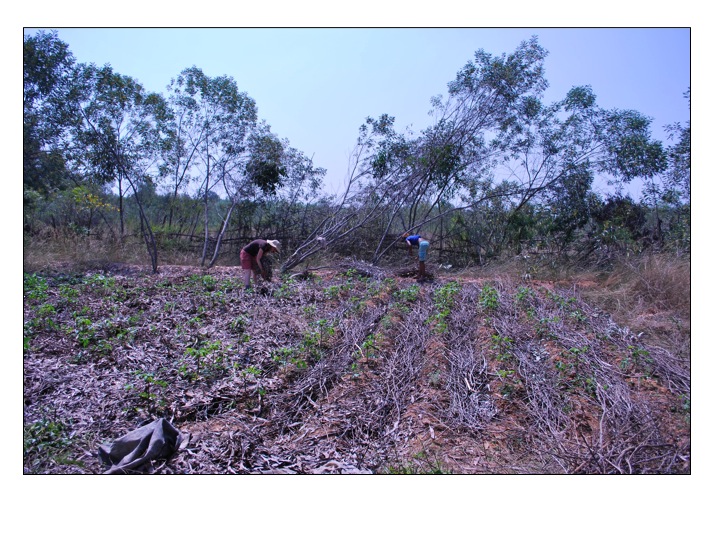 While there at Sadhana Forest in early 2009 giving a free PDC, myself and teaching partner Gautier Gras led a hands-on of using these materials for fertilizing the cassava patch. A normal ditch and mound system had been erected to grow this staple and was mulched initially. Because of the steep incline the mulch all fell to the pathways and the plants were left suffering in the hot, dry days. The plants were being attacked by pests and the organic garden managers remedy was a chili spray. While affective at first, it was merely a band-aid of a gaping hole known as withering soil fertility in the dry tropics. So with the 30 plus pairs of hands of our PDC, we mulched the pathways so that there was a level area to also mulch the beds. In the pic below on the right side you can see the aisles full of the Acacia branches while the left side reveals our ability to fully mulch the plants with small branches and leaves.