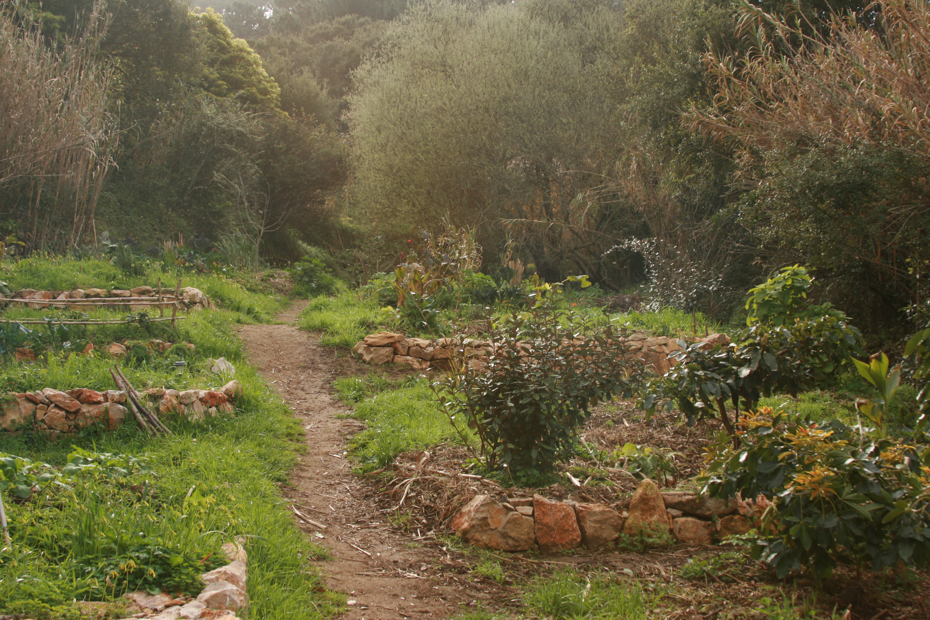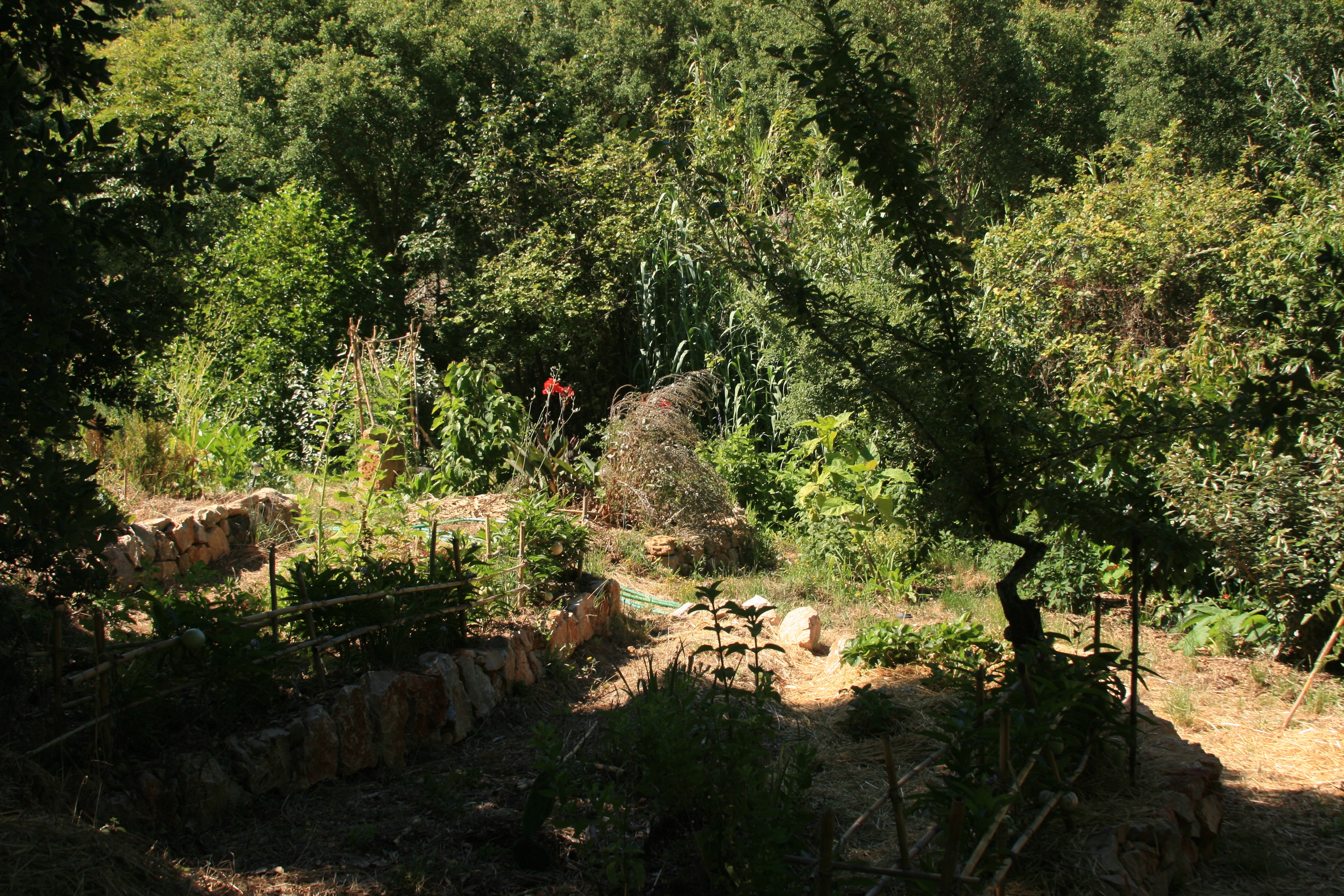 moisture in a stream bed. Thus when we approach laying out reforestation, tree crops, or even locations of gardens, it is often advantageous to go stream-side in a strategy called corridor planting. When coupled with other techniques of restoring natural stream hydrology, this strategy becomes even more potent for promoting life in these harsh places. Even in our fairly soft Mediterranean climate in coastal Portugal at Terra Alta, we have had tremendous success on one part of our food forest that is known as Caminho das Fadas (Fairy Path) with this strategy. There we took advantage of a flowing creek by planting many tree crops and their guilds along the waterways edge. We dotted trees in around those that were already existent as the people of the past had also planted tree crops in this area of the land. There was also windbreak trees that extended to the creek side like lemonwood (Pittosporum eugenioides) and trees like willow that were already thriving because of their roots systems being connected to the stream. This is not a new and wonderful strategy; rather one that can be observed through how nature operates and past agricultural traditions. As a practical example we planted avocado’s in two different locations in this section of our overall food forest. One has thrived which was planted near the stream and after four years started flowering and now in its fifth year is over 4 meters (13 ft) tall (2016). The other place away from the stream had two trees die and we have tried to plant again there for pollination reasons after a couple of years of soil building.