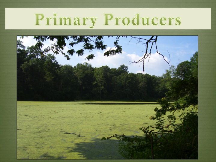 Primary producers: aquatic free-floating plants- duckweed on the surface, green color of algae, and the shoreline terrestrial plants - Emergent Plants