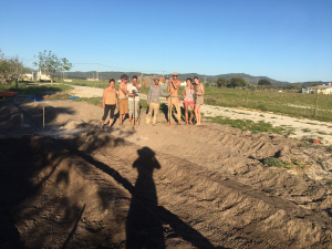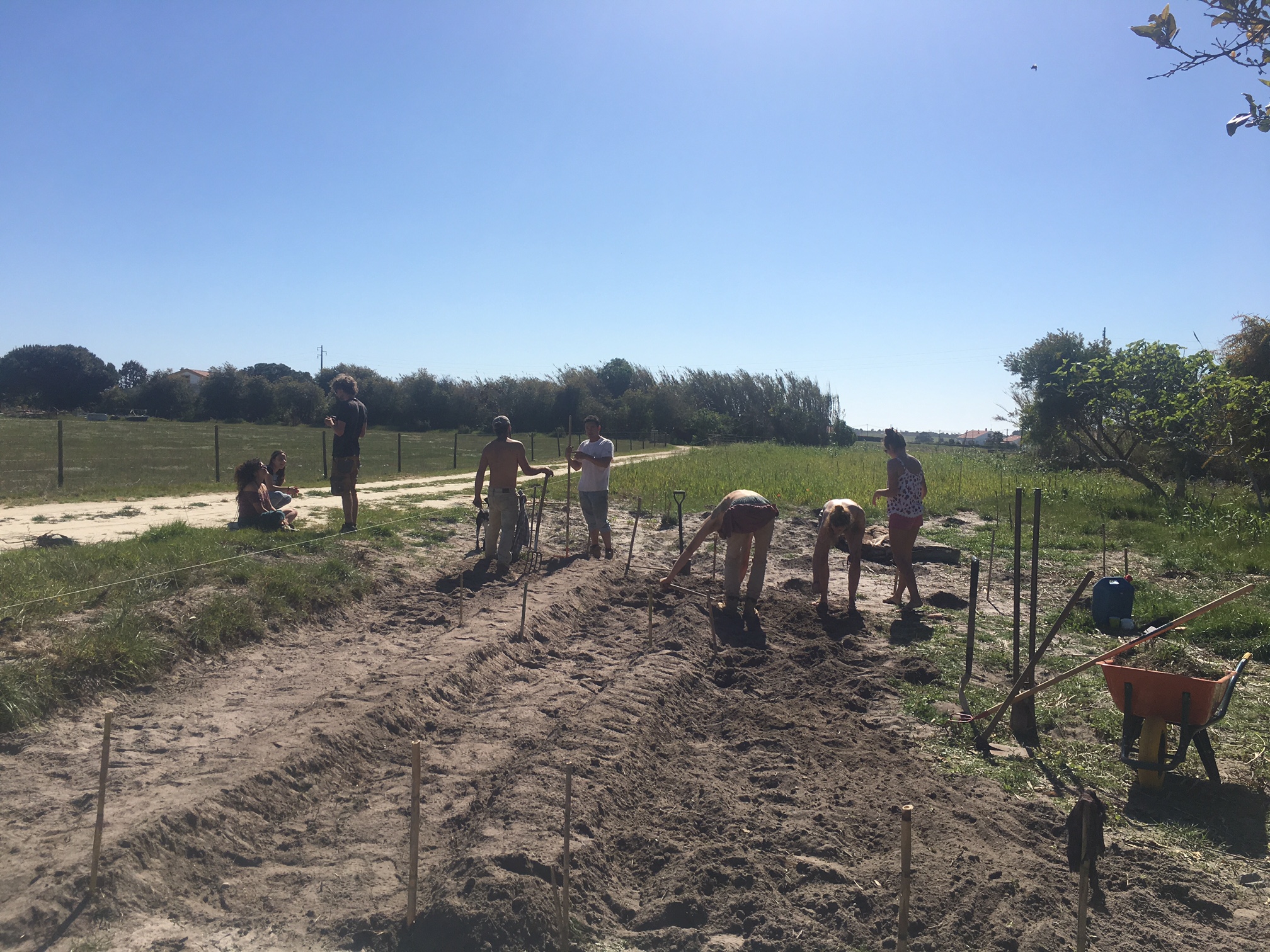back in 2013, we organized a Permablitz at the Bond Hill Garden. I had already done fair share by planting fruit trees out of my own pocket to share with the community there the financial abundance I was bringing in. So a group of 20 or so people did exactly that, had a tour of the garden to see how it fit into the Urban Greens model of leased land from the city. We explained the problem we were addressing through this hands on mission (a seepage spring and runoff soaking parts of the garden) and then did it. We had a meal and voila, we got a big swale implemented to slow, spread and sink this water. Another picture you will see below is from a students garden in Coastal Southern Portugal. After teaching a PDC in Spain in Early 2017, I went on a tour in Portugal, on my own dime, of past projects and visiting students and their projects. They hosted me well and I was there to give free advice to help propel them and their sites towards their goals. In one of the instances we were in need of some local labour to help the site progress quickly so we organized a permablitz and with a crew of only nine we were able to get a large portion of the sunken beds implemented. The site has extremely sandy soil, farming the beach essentially, so we were working on building soil for the future farming area. Josse, the landowner, leveraged his social capital in the area and we had good times ending with some food and some beers. One last instance was at a yoga retreat I was being employed at in Southern Spain in 2016 and ’17. The founder was leading a yoga teachers training and at the end of that we did a karma yoga session or permablitz on the land to implement sunken beds as well. Even though most had never picked up tools in their lives, I led a group of about 10 women in an intensive digging, mounding, and adding organic matter session of about two and half hours and got a tremendous amount of work done. And we had a lot of fun doing it as they were giving back to the site that had hosted them for the last three weeks. All examples of how community propels sites forward, a barn raising atmosphere of the modern day.