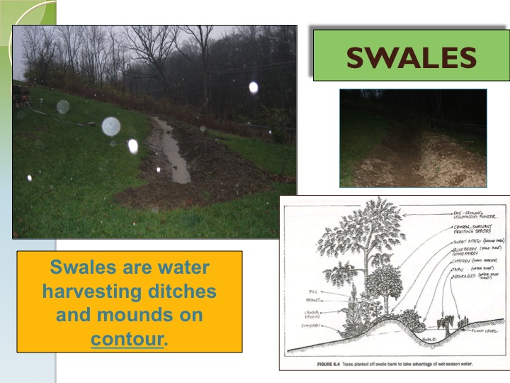 - Water ( berm and basin, roof catchment, greywater, aquaculture)