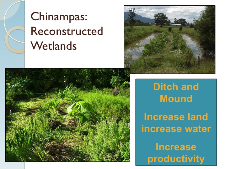 Chinampas or reconstructed wetlands: using high water tables and the productivity of aquatic plant growth to spur on soil development, food production, and slowly moving water through a sight with lots of edge.