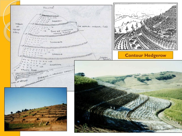 Contour Hedgerows: Using contour plantings such as vetiver grass to hold soil on steep hillsides with crops integrated between rows of contours.