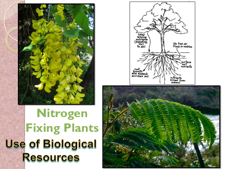 Another important design feature that exemplifies the principle of use of biological resources is the use of Nitrogen fixing plants and dynamic accumulators. Nitrogen fixers take the abundant atmospheric oxygen and through an alchemical symbiosis with bacteria in the soil, form a useable nitrogen input to plants once they pass through predator-prey relationships in the soil. If you breathe deeply now it is mostly nitrogen floating around but in soil it can be a limiting factor that is associated with the green growth of plant as