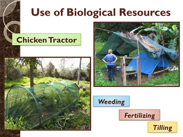 To prepare beds for planting, we can utilize a chickens products and behaviors while fulfilling some its needs while placed in a tractoring system. This means that we as designers and managers construct a cage system that confines the chickens in a small area but a big enough area for them to be comfortable. They then clear the ground of most weeds as they eat the green material, scratch for bugs and seeds, and the result is a slightly tilled soil and well-manured. Several keys apply to management and are the following: