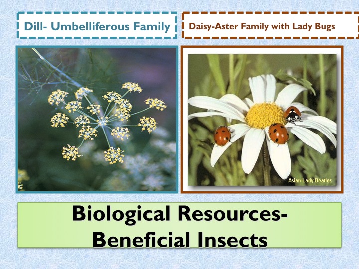chemical blends that often involve heavy metals whipped into a neurotoxin for insects known as pesticides. However, much research has been done on bringing balance into the system to stabilize the onset of insect attacks. By working with nature, we can design in and manage succession to encourage plants from the following families: Asteraceae (daisy family), Apiaceae (or Umbelliferae, Carrot Family), and Lamiaceae (Mint family). These plant families as well as some other specific plants help support various predator insects at different life stages. They also feed on prey insect which are garden pests. These plants can be designed in as guilds or if you leave abandoned strips of vegetation along the edge of forests or plantings can be maintained in herbaceous succession. Nature uses these plants inherently when it starts to regenerate systems because they help to bring balance to insect life.