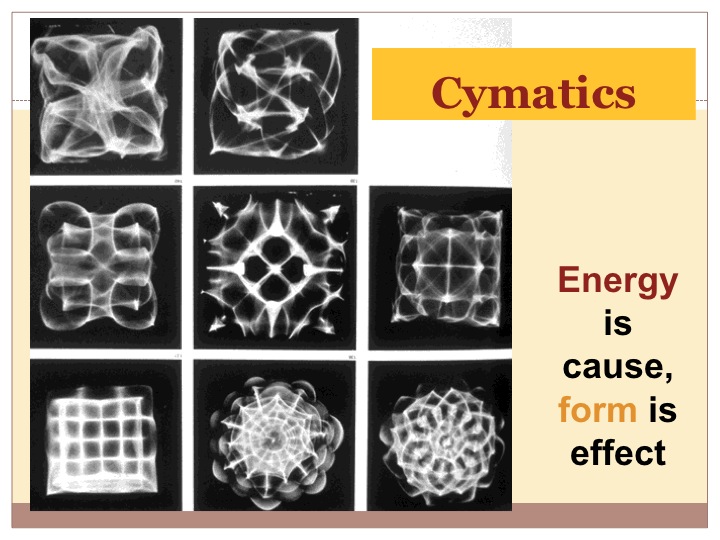 Cymatics, developed by the genius Jans Jenny, allows space and time to be reflected through vibration and a physical medium. Jans Jenny did experiments showing the vibratory effect of sound through a medium and created the system known as cymatics. The medium was sand or cornstarch laid out on a black plate where frequencies where played from a speaker below the black plate. As the pitch or frequency increased more diverse and complex forms where found. Vibration is an interesting perspective as the patterns laid in nature are tested through evolution for their efficiency and effectiveness. Nature has responded with a symphony of biodiversity and shows that the vibratory world has an impact on its surroundings. For example, I am sure we have all heard the stories of how playing