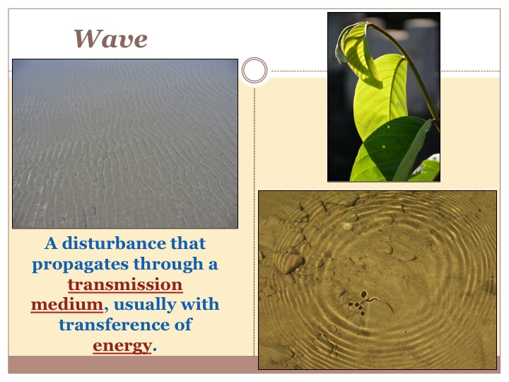 Waves of course are also manifested through still water if something disturbs it. Just as the definition of a wave is stated in the slide above, the disturbance would say be a rock thrown into still water (water being the medium), which transfers wave energy out until its
