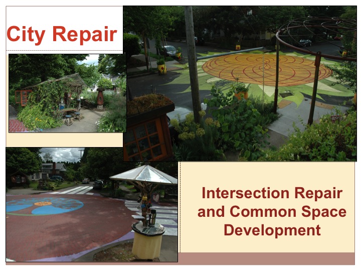 remarkable work of an organization called City Repair there in Portland, groups of people can apply for an Intersection Repair and Common Space Development Permit. They paint the pattern, do the creative edge work with chai stands and kids cob book exchanges and the like, and they can have block parties with advanced notice to the authorities. All of these facilitate pools of energy where ideas can be exchanged, fun can be had, and social interaction in general facilitated in a local vicinity without a direct need of consumption. They are truly wonderful sights dotted across the urban landscape in residential areas and put quite a smile on my face when biking through them in my West Coast travels and work in 2008. Thus the straight lines of the grid, which create runs and riffles were offset with these pools bringing a natural order through confluences of local streams of people.