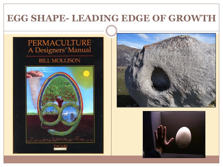 Even Bill Mollison choose to use the egg shape on the cover of his revolutionary book Permaculture: A Designers Manual. It tells a story using the symbology of the Australian Aboriginals and the rainbow serpent and in this version it forms an egg with another pattern we look at in this chapter: the overbeck jet. He tells a new story, a creation story if you may, with design allowing us to fuze the cyclical forces of photosynthesis, rain, sun, and soil formation. Combine that with earthworks and animal husbandry and you have the framework of this egg that is seeding a new culture; Permaculture.