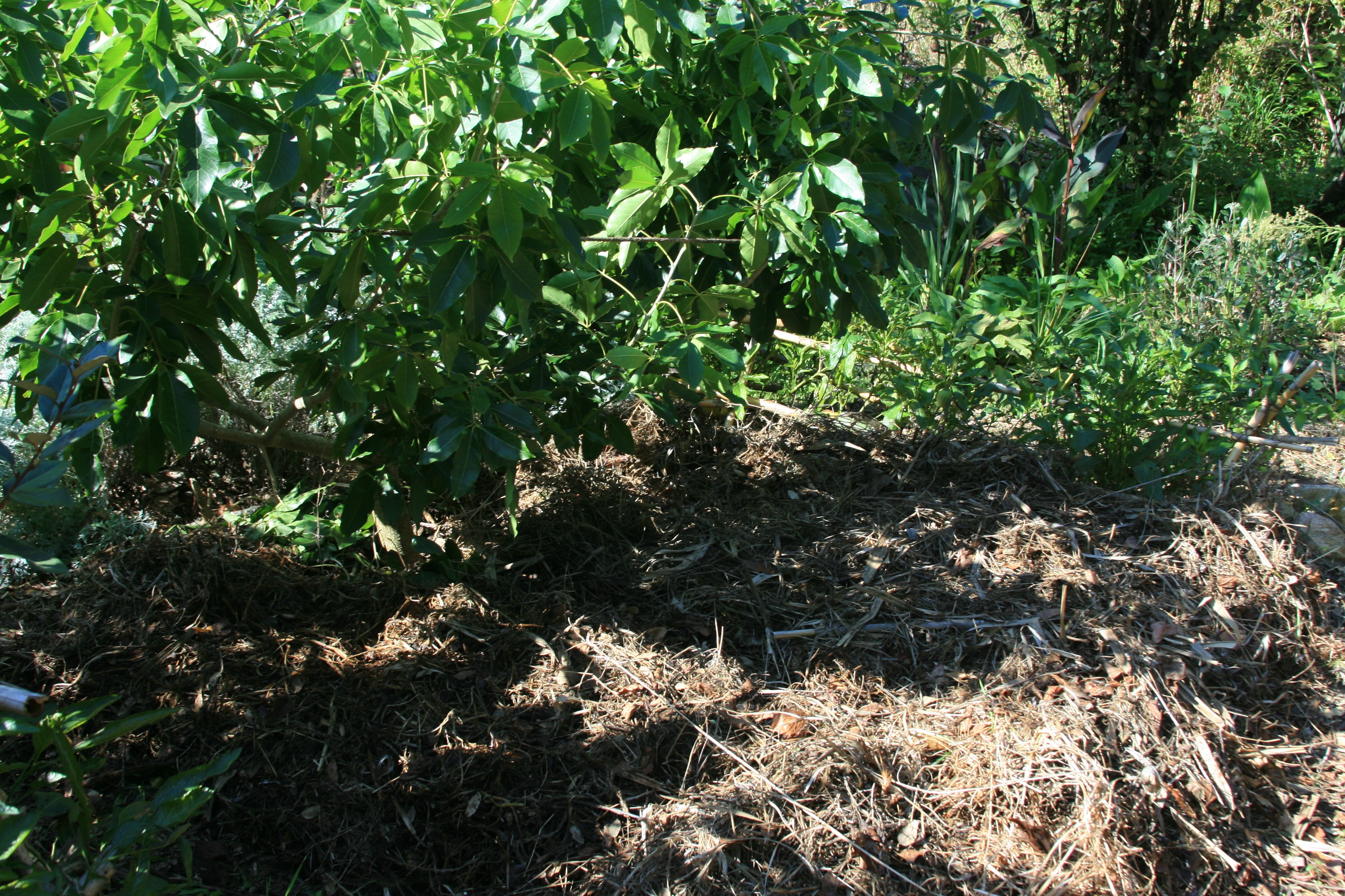 Now that the microbes have been reseeded, I then mulch to help feed them and create fertility. I not only do this with brown mulch like straw or wood chips but also cut green material. The green material is broken down by bacteria and the brown material by fungus. The tree needs both in the first few years so I keep going with this for a prolonged period until the tree feels more self-reliant. Each year I spread the mulch around just a bit further than the initial mulching as the trees roots will be growing deep but also horizontally where they feed. The mulch also helps to suppress weeds including those coming from the outside to invade so I keep slightly ahead of the roots. Mulch also helps to retain water and keep the ground surface at a more moderate temperature. All of these things create conditions that are conducive for growth and should be a priority. One thing, however, can cause problems which is mulching right up against the trunk so make sure you keep a half handful distance away from the trunk. If materials are rotting against the trunk it may invite pathogens to invade the trunk.