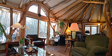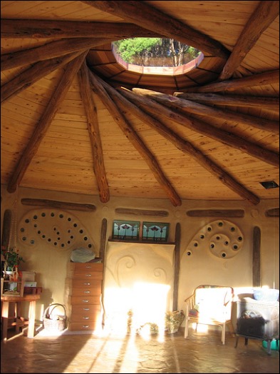 gaining in popularity and its accessibility within building permits which helps to legitimize it and really spread. This is saving some of our forests from senseless cutting for timber and calls again for a different management style and also consumer preferences. One of my favorite builders is doing just this with his company Whole Tree Architecture. Roald Gundersen manages his own woodlot for many of his buildings and was inspired from the natives of his local area and their tree bending tradition. Theirs was for communication and markers but his is for creating unique pieces for various uses in his popular buildings. He was the lead architect on a building I once taught in when the Sustainable Living degree program at Maharishi University of Management moved into their new building. I taught four PDC’s (2009-2011) there and just loved the feeling of almost still being immersed in a forest rather than a strict linear classroom. Another usage of this roundwood technique comes from reciprocal roofs and their unique design of one on top of the other in a spiral all holding each other up to help create a roundhouse. My mentors Robina McCurdy and Huckleberry Leonard has built one of these in New Zealand and had artfully put it together with timbers and delightful cob work and an earthen floor. The total construction was one of the best representations of pattern application and often mentioned in that chapter here on this online book.