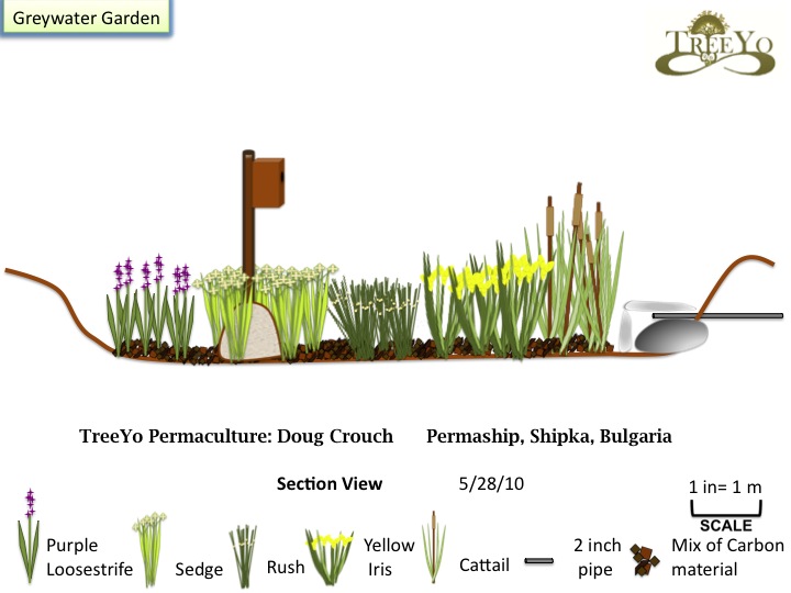 gadgetry. The main stressing point was that the pipe needs to fall 2% which was easily accomplished in this context after some concrete was broken, sand laid and pipe fitted. Then in the course we did the digging and planting of the basin. Procuring the diversity of plants was a fun trip to a mountain wetland in the Balkans, what a tough gig! But the earthwork was very basic, matching maximum outward flow of water from the all the sources. Greywater dictates this accounting and some simple math equations. If every water source was to fill the pipes simultaneously (dish water drain pulled, toilets flushed, bath water drained, and toilet flushed, etc…) then the greywater must be sized to handle all of these flows.