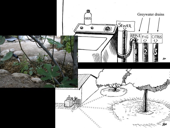 Below are slides from Brad Lancaster and are a great example of creative human interaction and the principle multiple elements for the important function. In this case the filtration system for the greywater would be overloaded by having this flow just go to one space. However, through a simple, yet clever, alternating distribution system, the energy of waste water becomes a resource instead of a polluter. The laundry can be diverted to one of three trees and a simple system of moving the tube to the right each time laundry is done allows the balance to be reached. Genius really, and I have seen this time and time again with other high flows of energy like kitchen scrapes. Taking it to the same bin day after day and not adjusting accordingly creates a methane producing, maggot ridden, pile of putrified organic material rather than the desired outcome of compost. Similarly in greywater, salts can build up, basins become waterlogged, and pathogens breeding but the above system avoids this brilliantly.