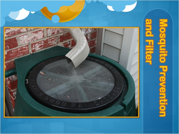 Here in this photo of a small rain barrel of 60 gallons or 240 Liters, the top mesh is multifunctional that it filters the water to a certain degree and keeps mosquitos out. With a tar and gravel roof in place, which is common is these hard freeze areas of Ohio, USA (zone 6), this feature really helps to keep the water quality higher. With our abundant all year precipitation, these tanks help to supplement garden watering while not holding a huge volume. They
