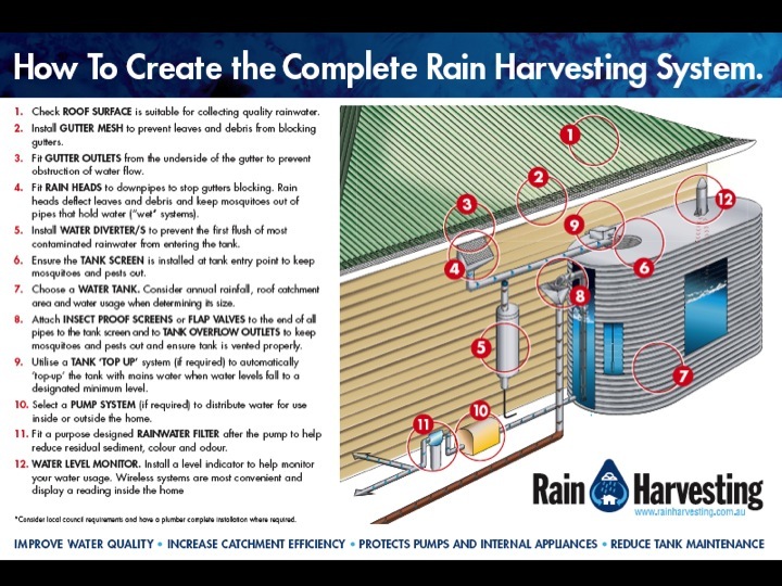 As a review here is another rain catchment system with the descriptions along side of it above. This system does employ a pump and is more sophisticated as it is an area of Australia where rain water harvesting is becoming mandated. As legal authorities in drylands areas see this inherent need, these systems will become more and more commonplace.