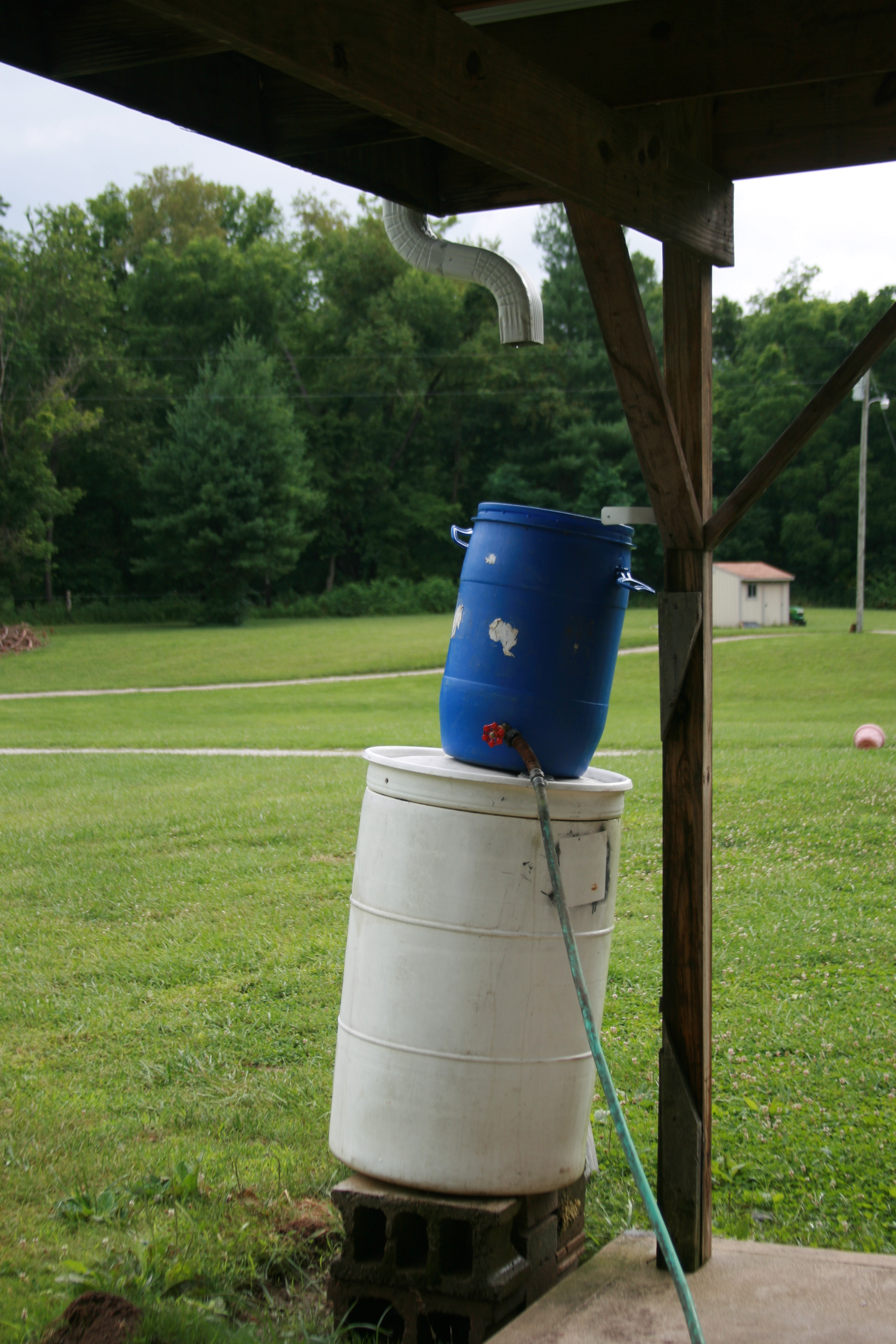 Cisterns are often unnoticed as they are combined with concrete pads that make a patio space. Below is pictures of cisterns from the house and bar at the family land project in Kentucky, USA- Treasure Lake. To augment the awkward placement of the cistern in relation to the gutters at the bar, an initial tank was installed to hold runoff and direct it into the cistern with a garden hose. While not a perfect system, a bigger initial holding tank is desired to handle the heavy rains we often get and also be extra storage for when the cistern does fill. The cistern at the house comes from gutters and pipes that catch all the roof water and direct it easily there. Many in the community are on cisterns and elect not to harvest rainwater. We bring our drinking water in from trips to the city so domestic and irrigation use it is perfect. We hope to never have to buy water again from the truck delivery man and increase the potential of the bar catchment system by adding a 250 Gallon tank to better deal with the flows.