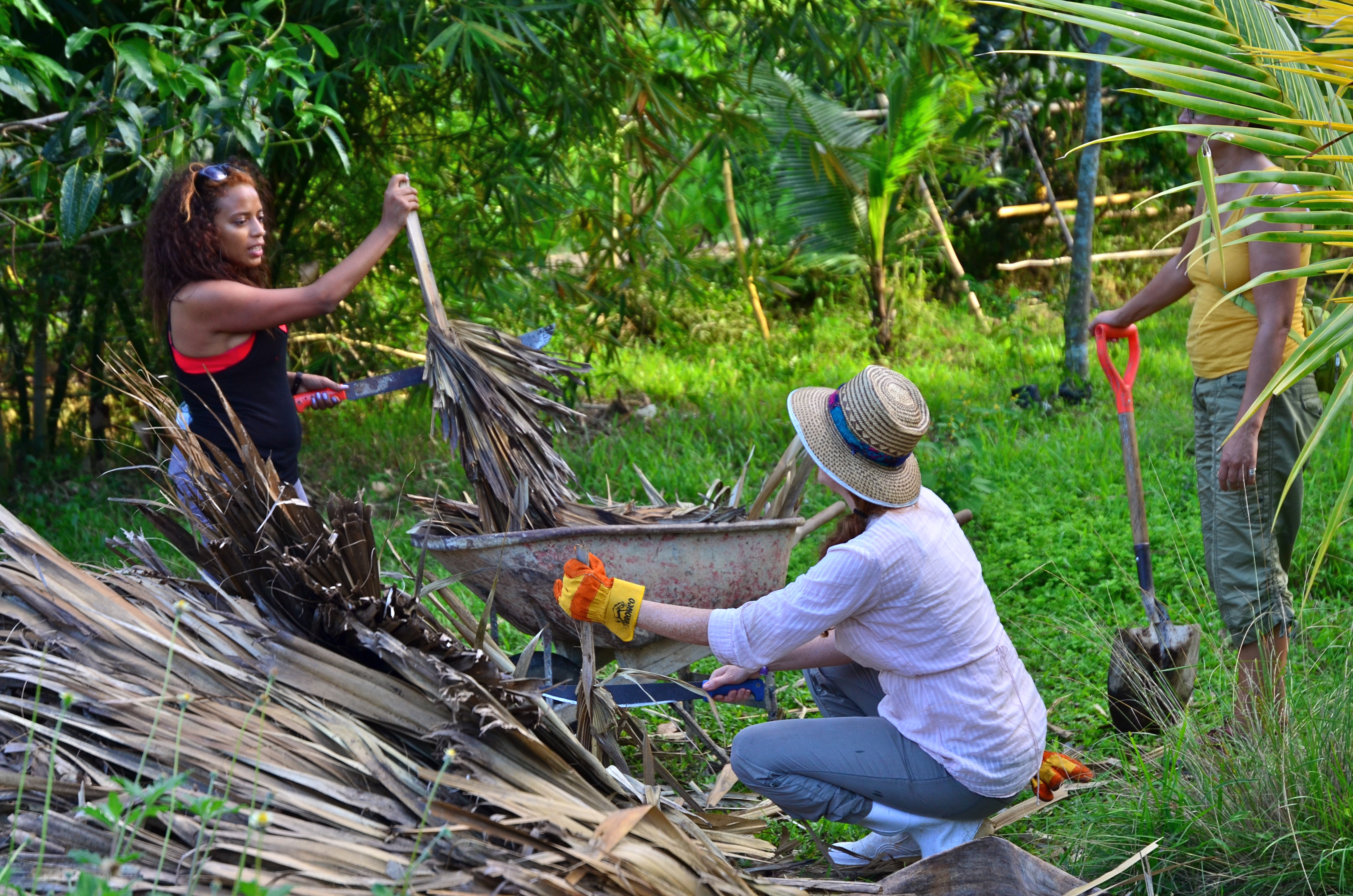producing tree crops. Walking through with a machete, secateurs, loppers, or pruning saws, allows us to balance shade and soil cover depending on the time of year. In general material is cut in wetter parts of the year in those climates that have pronounced wet/dry seasons. Fungus is more active at this time and the sun and wind not such a limiting factor in terms of dehydrating the landscape. Thus the canopy of say a gliricidia tree in the tropics is reduced by 1/3-1/2 and the material fed to surrounding tree crops. If planted in relative location to a cashew tree, the nitrogen-fixing plant like gliricidia will also slump off roots and feed the tree below the ground. However if the rainy season has subsided you are better off having shade and wind protection so time your cutting so that your trees are fully mulched in rainy parts and when things start to dry out you are not scrambling to mulch then. It’s not just nitrogen fixers either, but trees that grow rapidly like mulberry can even be used.