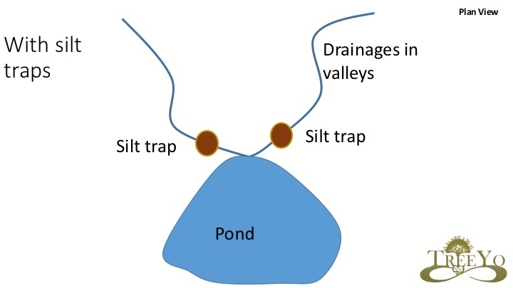 Locating these design elements in the landscape is simple. You put them just above your intended earthworks or tanks where they are easily accessible for cleaning them. They will do their job of trapping sediments and in the case of leading to a pond, you don’t want all those sediments in a pond because its volume is decreased and succession occurs much more rapidly in terms of the pond eventually morphing into a wetlands. They are located within the valley flow that fills a pond normally. They are cleaned either by hand or by machine depending on the size of catchment and how many sediments are moving. Furthermore one way to turn this problem of movement of sediments into a solution is when you harvest them put them in potting mix. This further reduces our needs for outside inputs thus saving, time, money and resources.