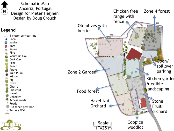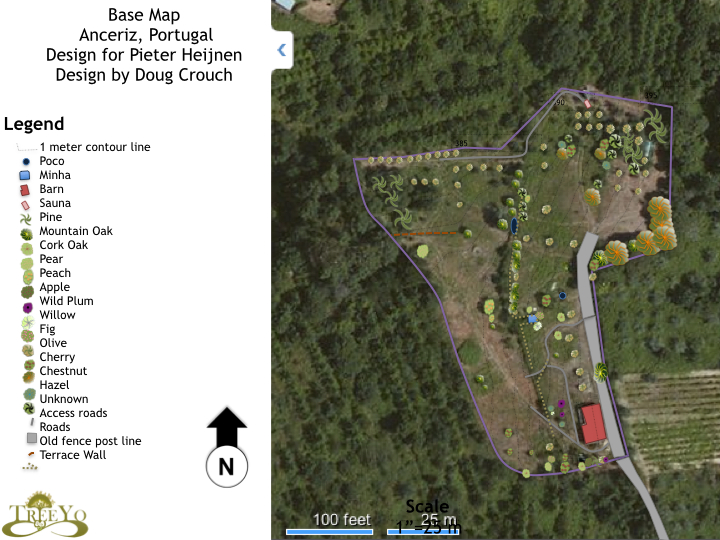 I tend to use a combination of as many as possible when the availability is there. It’s not easy making maps in some parts of the world while others its extremely easy. For example at my families land in Kentucky, USA, I can utilize high quality maps from GIS systems to get started. They give relatively precise boundaries and even better they offer two foot (60 cm) contour lines. This allows for a greater depth of planning not possible when just using a Google maps screen shot. However, with Google maps there they offer a lot more satellite images from year after year (or used to). This allows me to effectively utilize the history button they have them to see the progress over the years of how the site has evolved. However in Portugal neither are available, which has made documentation and planning of the small scale intensive project of Terra Alta more difficult. The Google maps image is dated to say the least, around 2009, and there is no GIS (SIG in romance language) available. BING however does have more up to date satellite imagery in general there in Europe. In Portugal when I have had access to contour maps they were all made with a surveyor, which allows for a greater depth of designing and planning due to contour map generation. This has allowed for water and earthworks systems developments like Keyline, which is absolutely necessary to have good maps for the initial stages of design. There I have also developed base maps with the use of deeds because it is the only reference of property lines. Google maps images provide this nice resource of a satellite image but no clear indication where a property ends, unlike GIS. Thus combining the deed with this allows for a base map to be drawn up. Often lines of trees on a boundary helps to bring the two together when doing an overlay. I can reference a certain boundary I see on the map and fit the two to scale.