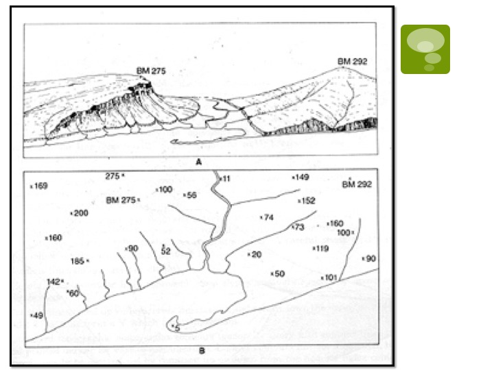 Thus when you go to read a map, when the lines are spaced close together, that means there is a rapid change in altitude indicating a greater percentage of slope. This affects how water flows as the steeper the hillside the more likely we are to have erosion. Also it changes our earthworks capabilities as you move up in steepness swales are not possible and then we need to go to terracing when such earthworks are really needed. If contour lines are spaced really far apart when you have say an accuracy of two foot (60 cm) then the land is quite gentle and approaching flat. Also when reading such maps it can take some time to see where there are valleys and where there are ridges and their relationship in terms of size in the landscape. You can always find valleys through looking at the contour lines and seeing the way in which they point in terms of the contour lines changing in altitude. If they point towards a higher number, say 520 feet above sea level pointing towards 540 feet, then you know it is a valley. It’s the opposite with the ridge with it pointing down towards 500. Take the test below and see if you can use this knowledge to match the numbers with the appropriate letters on the corresponding landscapes. So the contour lines help you decide which landscape is which.