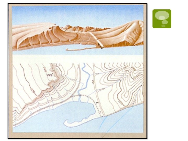 When looking at topography our brains need to extrapolate out the lay of the land to see in 3-dimensions. They help us to see when landscapes are steep and when they are gentle. You see ridges and valleys and you need to be able to see these conditions not in 2D, like the map, yet rather 3D from our minds pulling them outwards.