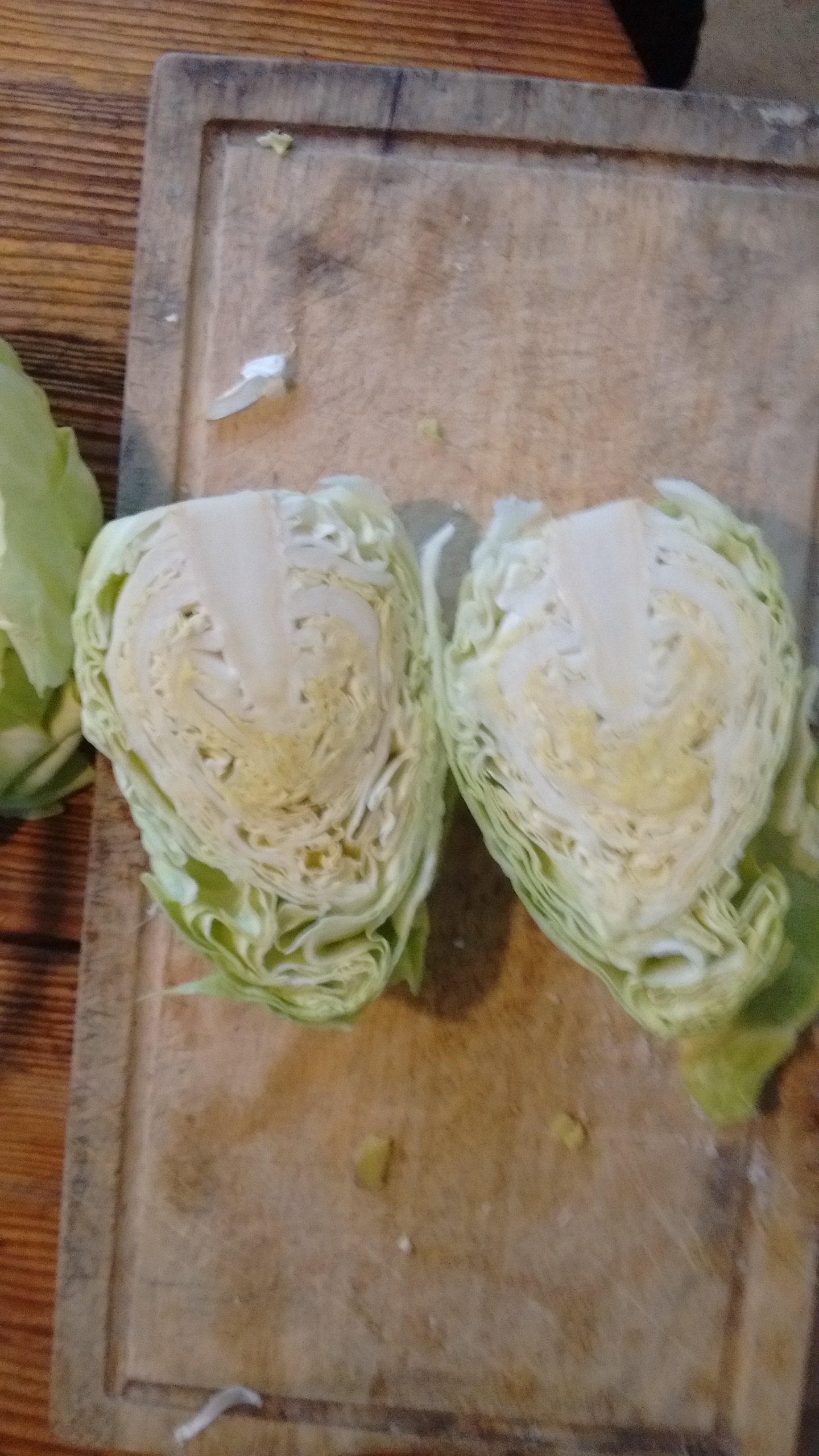 From there I quarter the cabbages or cut them in half if they are smaller. I do this so I can measure how much salt goes in. I do a very non scientific measurement of a fat pinch with two fingers and thumb for every quarter of a cabbage (farmer sized hands so for smaller hands use three fingers besides the thumb). This goes for your standard round head that is of quite some size and compactness. Otherwise just measure accordingly to what would be a quarter of a standard cabbage. If you don’t buy organically the juiced up ones I usually count as six parts instead of four. From there I either cut finely with a sharp knife or if you are willing to invest in the aforementioned cutting tool it does speed the process. I take the cut cabbage and add it to the big glass or plastic bowl on the side and remember how much I added of cabbage so I can measure the salt.