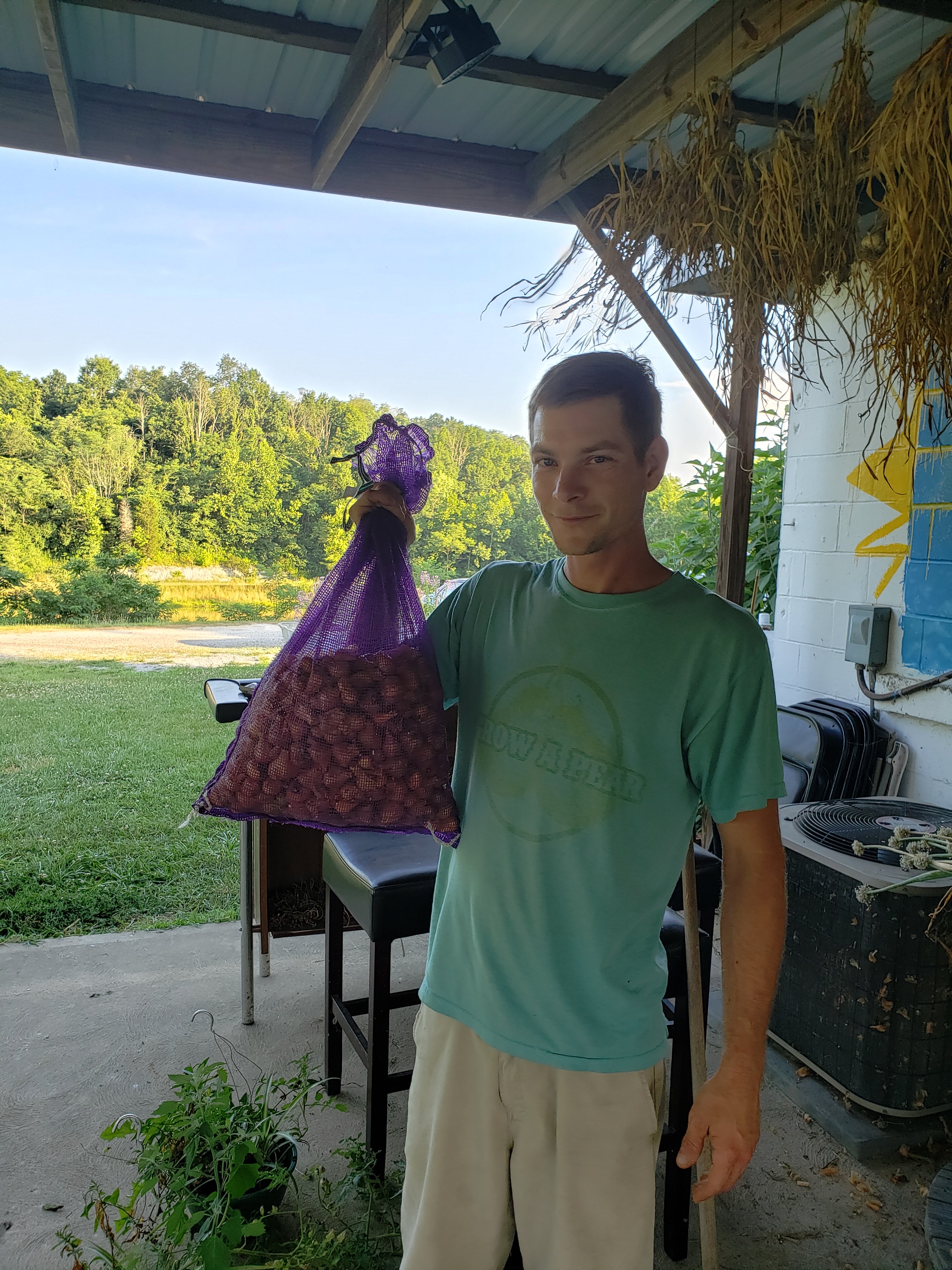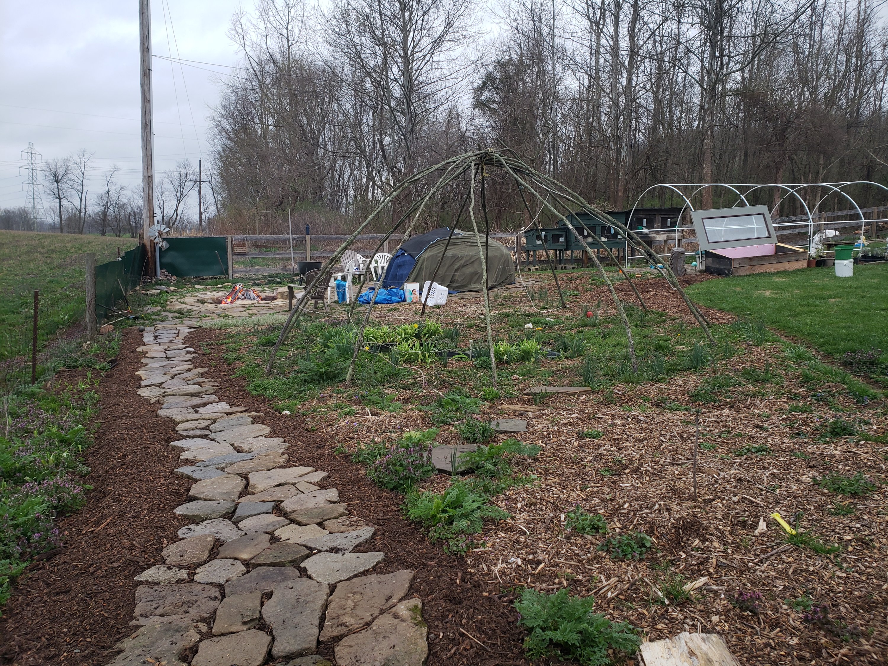 Daniel, My neighbor down the road, holding a bit of his Egyptian Walking Onion Harvest dried at the lake Backyard Permaculture elements at Daniel and Colleens, vine trellis, pathways, sweat lodge Front yard terraces at Daniel and Colleens, to the left food forest Recently planted honey berry Josh and Maddy’s Homestead: Petersburg, KY