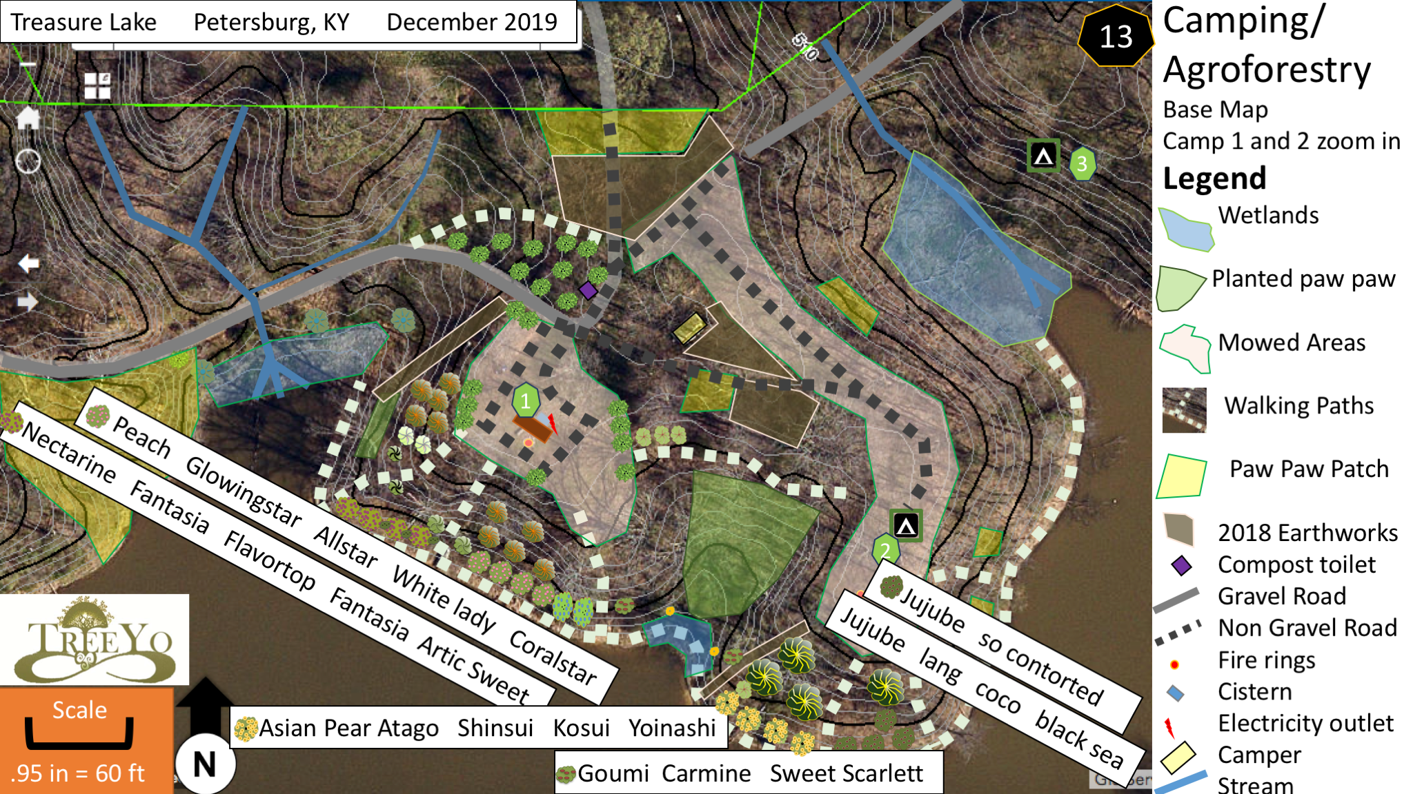 Full Site map so you can understand overall placement Over the years I numbered the campsites 1-5 but through use of a machine and general edge development, more campsites were developed. I never renumbered them, just added .5’s to help keep the continuity of name and place going. This particular space is a place that has been being developed for quite some years now with grafted paw paw complimenting the huge paw paw patch already there (planted in winter 2016). Thus in the spring with both the year-long PDC from the Cincinnati Permaculture Institute and me and Abby’s Spring class, we planted in lots more. With the PDC we planted terrace edges complimenting the chestnuts planted the fall before with Tom. This planting pattern was black capped raspberry and serviceberry flanking the chestnuts. Then with the other class we did a corridor planting with a mix of elderberry and hazelnut along the dry streamed. Even with the drought and no rain almost everything survived. I did a demonstration planting first with a beautiful Russian Hawthorn going in. Furthermore, in the fall we planted one more tree with Allison, a contributor to the place in so many ways. She donated back by purchasing a tree after her Into the Deep Soul event at the lake and her further connection to this place was solidified with a tree planting. On one of her volunteer days, I earlier in the day had been at Braden Trauth’s house, the director of the Cincinnati Permaculture Institute, and he had given me a Jujube of Chinese date fruit from his front yard tree. I gave it to Allison and she loved it! We decided to replace a Jujube that had died out in this area. There was still one alive in this area that was planted years ago when the grafted Paw Paws were planted. Thus we dropped a Black Sea Jujube in and hopefully the pollination is there for the two to thrive in this outer zone area.