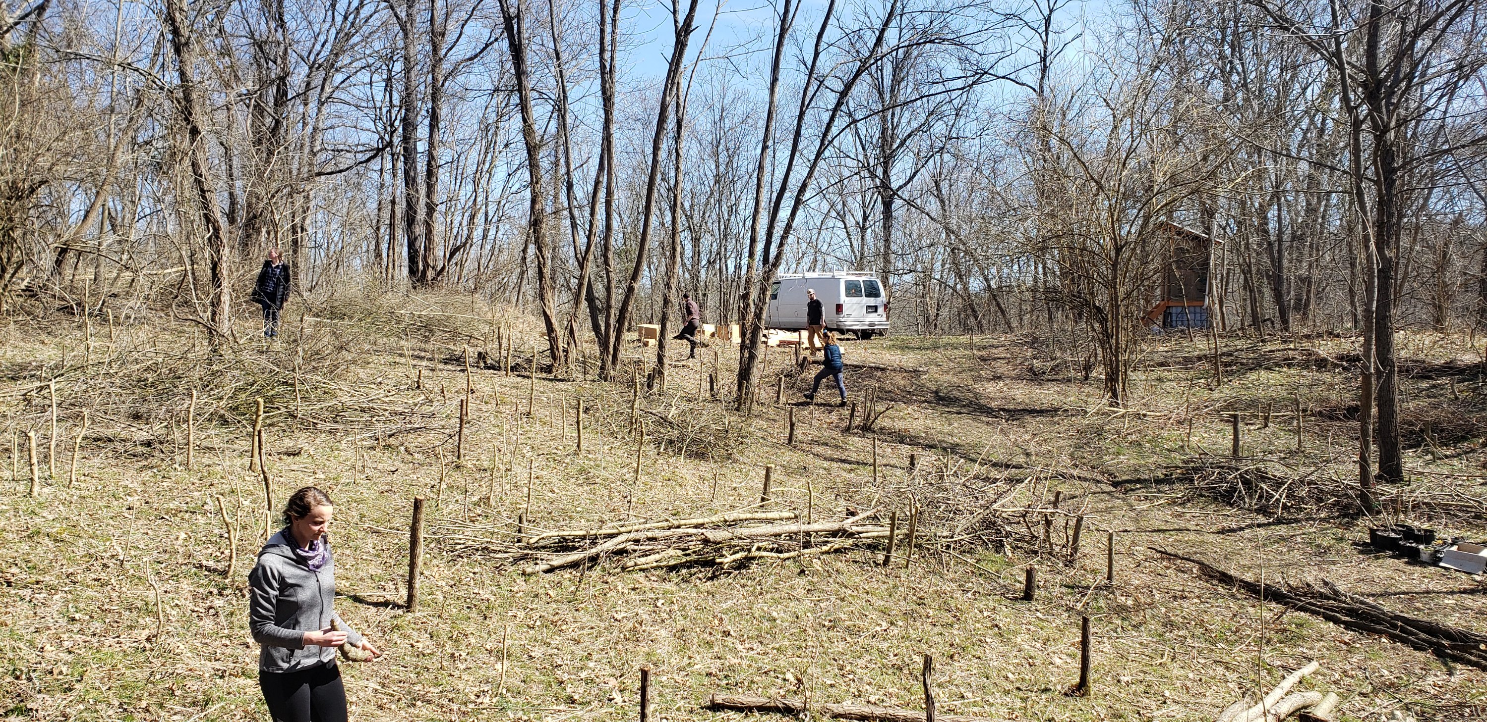 From there we moved onto the nectarines and blackberry to the west with two of the nectarines going on a terrace that further framed the pattern development for more of the banks. The blackberries were self propagated while many of these trees I am mentioning came from The Cincinnati Permaculture Institute’s Growing Value Nursery which is partially housed here at the lake. Above the nectarines down the main path path two Carolina All Spice trees were added to be entry trees. Further above the nectarines to the west deeper in shade we added witch hazel and vernal witch hazel to diversify the native palette. From there we moved eastward with other friends like Robert and Rachel helping with more individual tree planting terraces. To compliment the non native Eleagnus, we planted in the cultivar of Goumi. To compliment an already existing mulberry we put in another homegrown one as well. And we got a couple of Elderberries in the valley in between camp 1 and 2 below the 15 paw paws planted in fall of 2017 in that same valley. On the path we added a couple more russian hawthorns to the first one we planted in spring with Matt Gillespie, my paw paw class partner. From there we moved to the banks of campsite 2 and added in were 4 chestnuts procured through a trade with my friends Michael and Joanna down in Berea, KY but a Portugal connection. They got some of my paw paw, I got some their chestnuts. From there we knew we needed help and had our pattern well enough dialed in to invite others to come in and support and learn from our pattern. Thus we planned a permaculture action day of terracing and planting and over twenty people stopped through with over 150 ft of terrace dug in difficult conditions. All in all we planted 3 Jujube on elongated terraces and one on its on own in the furthest west part of the banks development. It is a rough and tumbled point showing to plant something hardy with the spiny vegetation that persists already. And west of that added was a very long asian pear terrace that four different cultivars fit on quite well. Above that I was going to do a fifth but as we were chopping and dropping scrub vegetation I found a hawthorn and decided to add in another Russian hawthorn there to compliment. That action day was great and yes a lot of work was done physically but also community formed. From there we made one big push as tree planting season was ending. The push was to get in the peach trees, an homage to my moms father who had some great peaches his suburban edible landscaping in Cincinnati. My mom wanted to plant this memorial garden and we again moved large logs for terraces, did terrace sculpting of the land, painted the landscape with four different cultivars of peaches, and interplanted with chokeberry. We sheet mulched heavily with cardboard and two loads of wood chips of my van with some friends helping to make the final push of the mulching. All along the way we added compost to the trees, home grown in my worm bins, and made cages to protect as the wildlife pressure is just two intense to not to. And as we sat on those banks with the fading sun, we realized the place had changed forever, in a very dynamic and positive way.